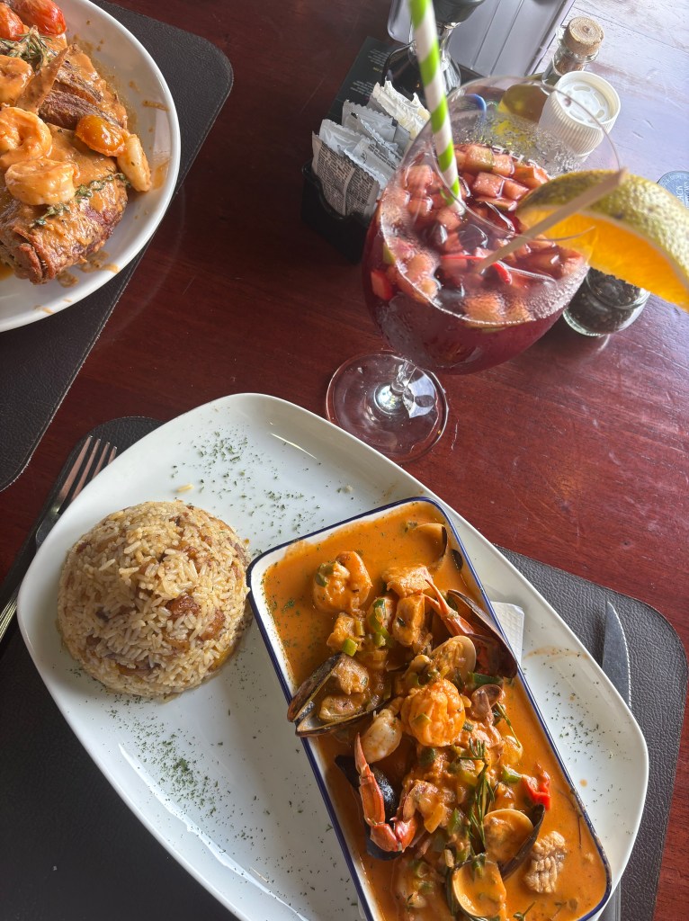 Snapper’s House: Down a few side roads away from the town centre, this restaurant wouldn’t look out of place on the seafront. Nautical vibes and a menu full of seafood, I could almost hear the ocean. I ordered the Arroz Puerto Viejo where the rice was the star of the show. Cooked in coconut milk and speckled with caramelised sweet plantain, it was soft, sweet and tropical. Served with mixed seafood in a tomato, calypso sauce. This and a glass of deliciously fruity Sangria came to 12,500 colónes/ £18 which didn’t break the bank.